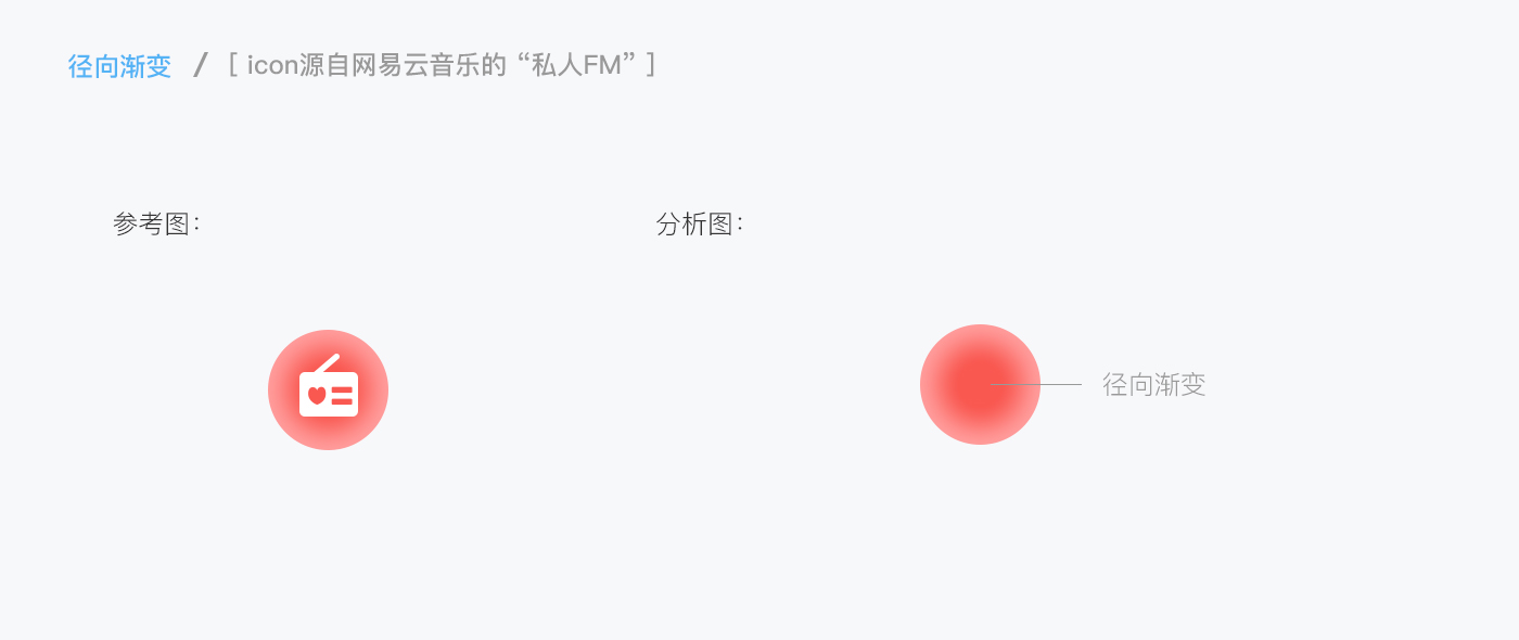讲解:渐变类型是径向渐变。如私人FM的图标,后面的园底是一个饱和度的径向渐变,而且饱和度的跨度很大,给人一种朦胧感。