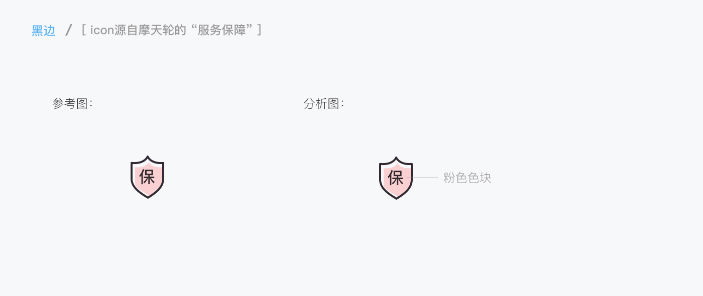 讲解:黑色的线性图标,加上了有色色块。如服务保障图标,整个图标是黑色,但加上了粉色底块后显得不太单调,丰富了整体感。
