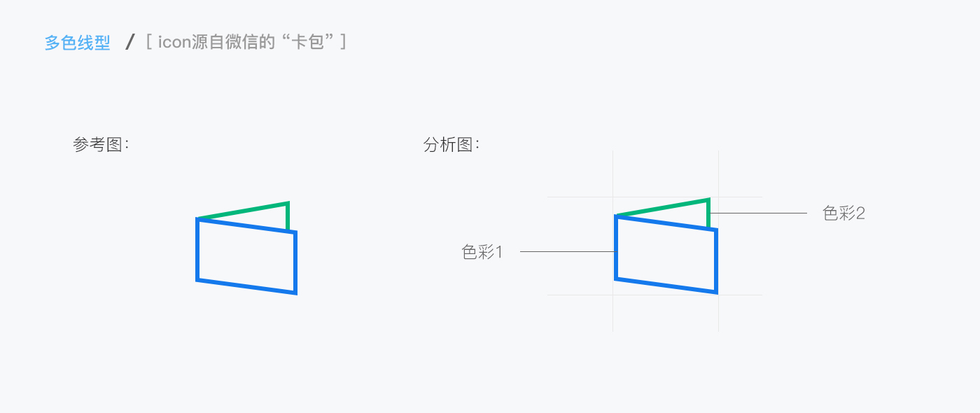 讲解:前提是线型图标,在配色上用了两种或两种以上的色彩。如卡包这个icon用了蓝色和绿色的组合。