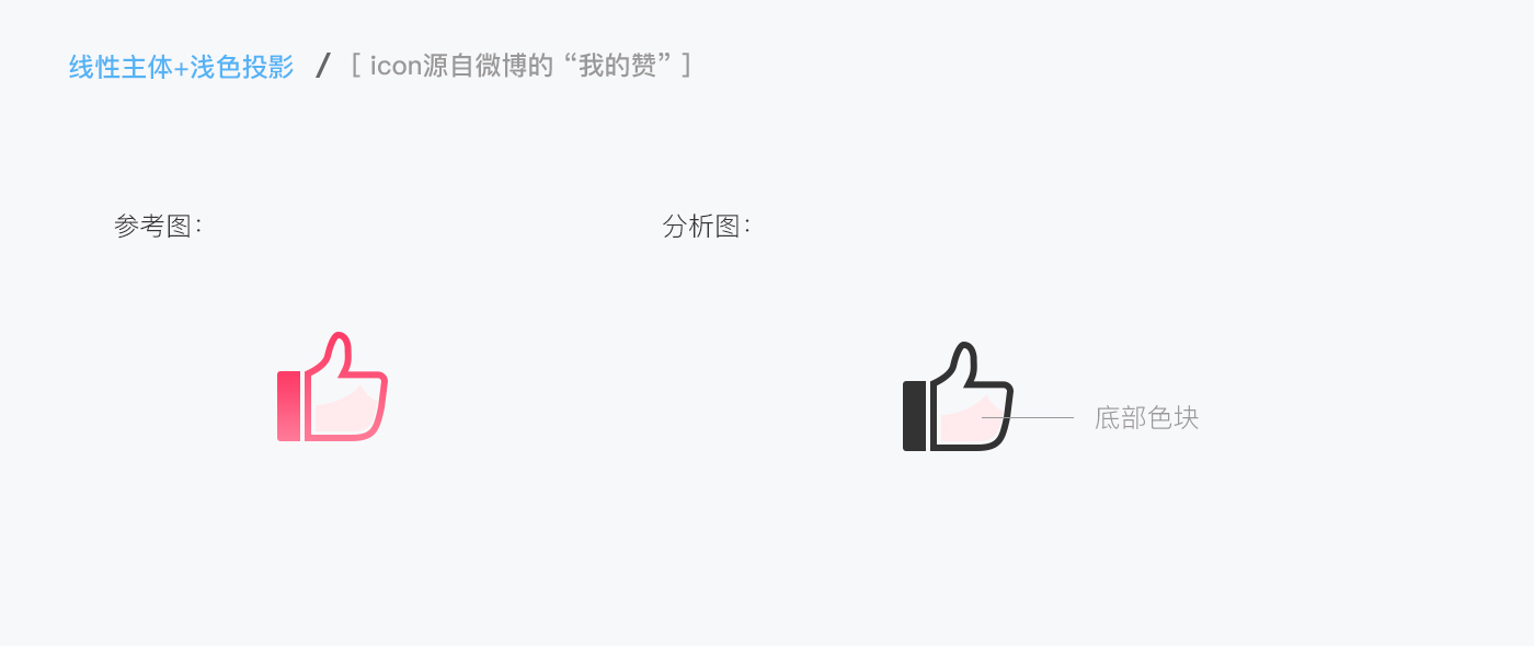 讲解:线性图标底部给一块明度高饱和度低的颜色块,貌似投影一般。如我的赞图标,赞这个图标下面给了一个较浅的色块,给人一种投影的感觉。