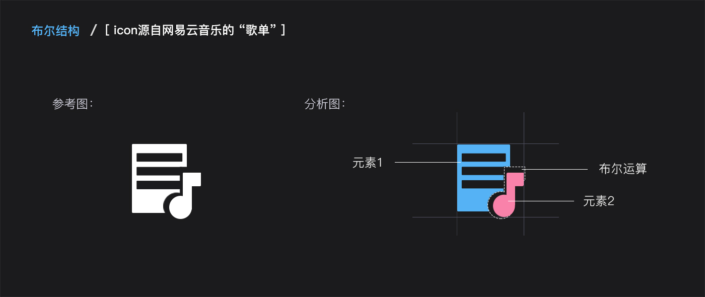 讲解:此类图标存在布尔运算的设计,如歌单这个图标,含有一个表单的图形和一个音符,他们的重合点是音符和表单做的一个布尔(减去顶层),使他们两个很紧贴的成为了一个整体。