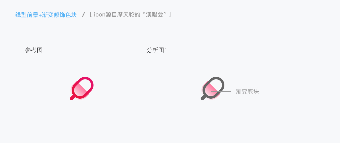 讲解:线性图标后面加上一个渐变底块。如演唱会这个图标,是个线状,但略显简单,但设计了一个渐变底块,起到了很好的装饰作用。