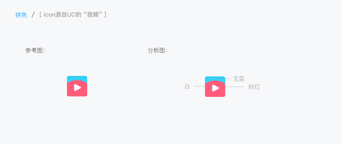 讲解:图标含有多个色相的颜色拼接在一起。如视频这个图标,用了白色、粉红、宝蓝三种颜色,组合在一起带来一种不一样的感觉。