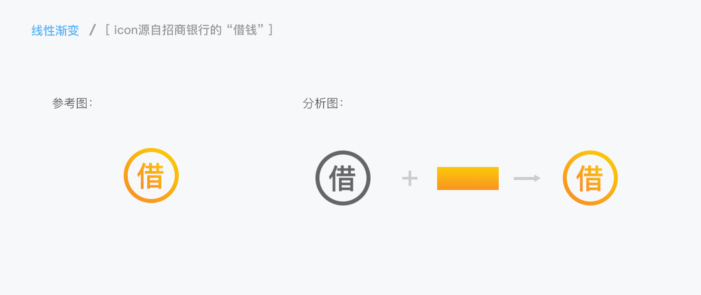 讲解:线性图标加上渐变。如借钱图标,图标虽然前面是一个“借”字,但并没有面状结构,所以还是线状结构的图标,然后整个图标加上渐变色。图标给人丰富感,不会单调。