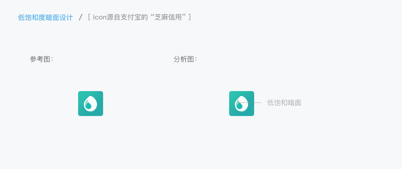 讲解:图标绘制存在暗面,暗面用饱和度低的主色系。如芝麻信用这个图标,前面的图形刻画了轻微的暗面关系,颜色用的是主色系调低饱和度的浅绿色,整体感觉很干净也有光影关系。