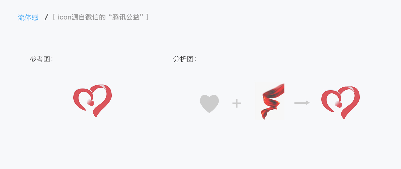 讲解:图标整个感觉是很有弧度很有流动感,如腾讯公益这个icon设计核心是一颗爱心,在爱心的表现上用了流动感很强的绸带。这种图标在绘制上是需要手稿绘制,不断刻画流动感。