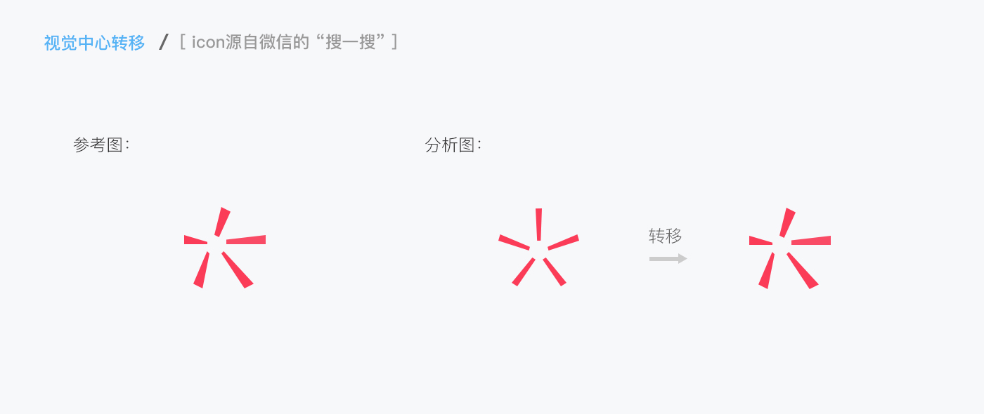 讲解:图标的中心不在正中央,而是转移到别处。如搜一搜这个icon,五个条状指向的位置并不是中央而是左上角。