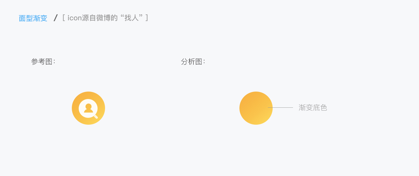 讲解:图标有个渐变的圆底块,前面为浅色主体带投影的设计。如找人这个图标,是一个橙色到偏黄的色渐变。一般这样的图标很多用于金刚区。