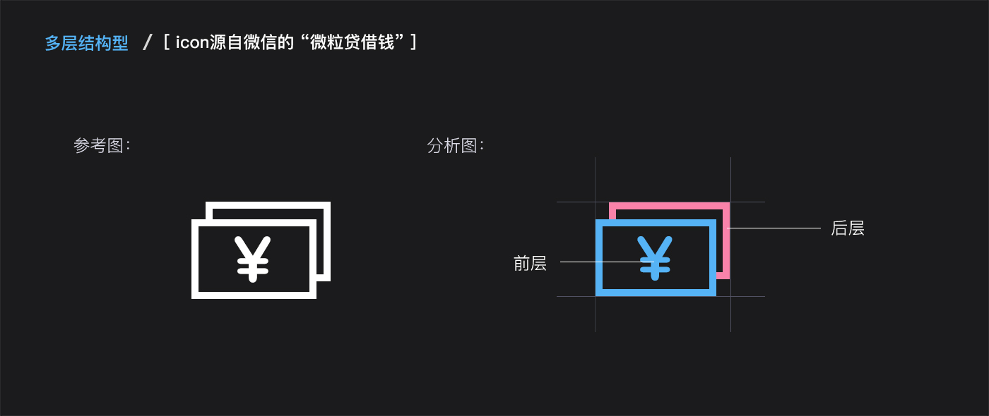 讲解:图标存在前后关系,或则说是多层关系。像微粒贷这个icon一个正方的基本型和一个钱币的符号就可以表达,但这样会显得太常规,不够有趣。多层设计很好的提升了可看性。