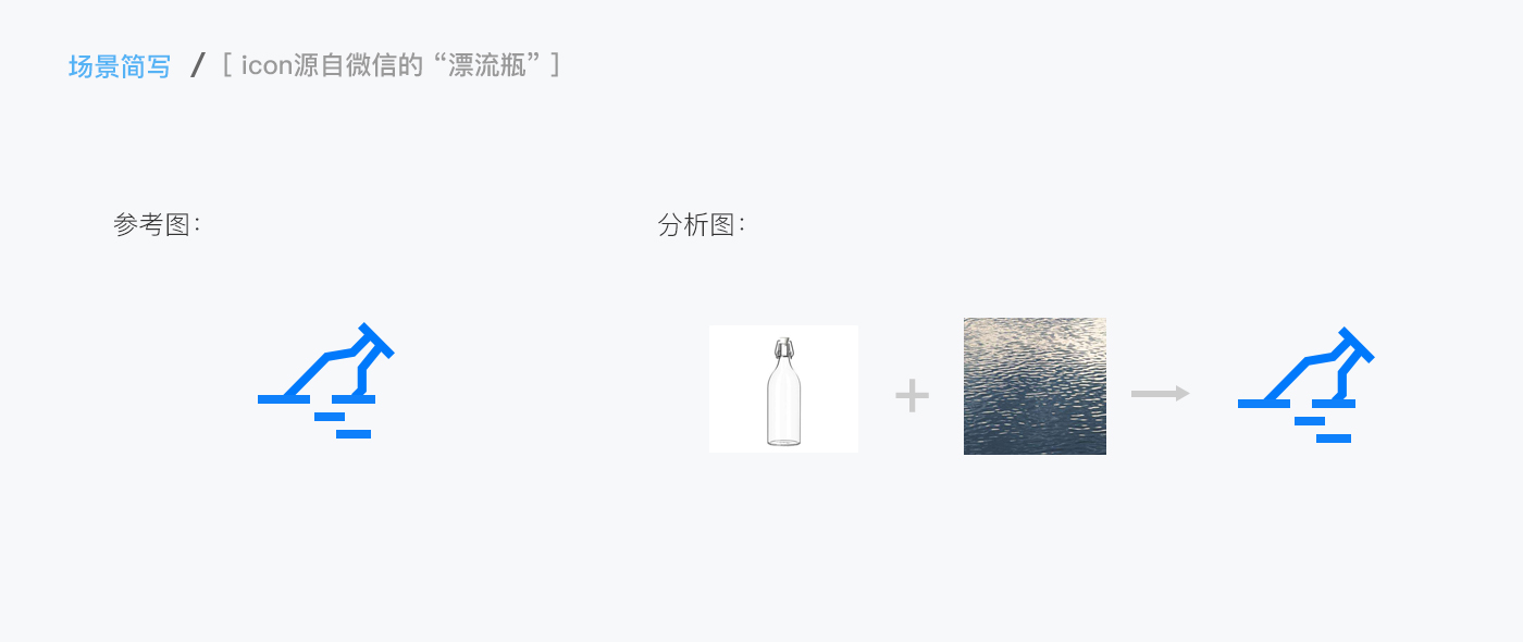 讲解:图标简单的刻画了一个场景,如上图的漂流瓶icon,通过瓶子为主题以横线的水波纹理作为背景刻画了一个漂流的场景。