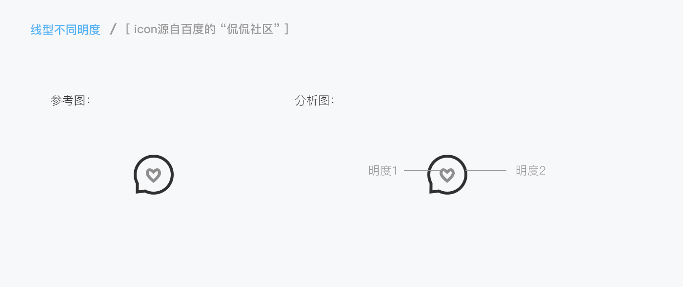 讲解:无色线性图标上,对不同线条做不同明度的处理。如侃侃社区这个图标,用到了两个灰度,一个是爱心的灰度,一个是气泡的灰度,给人具有明暗变化的感觉,丰富性提升了很多。