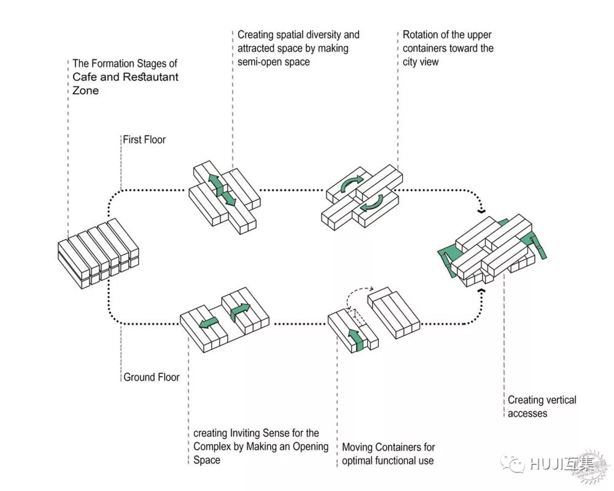 东部上方的集装箱稍稍旋转一定的角度,使空间能够面向城市主要景观朝向,并且在地面层形成开放空间,从而让整座建筑具有欢迎感。