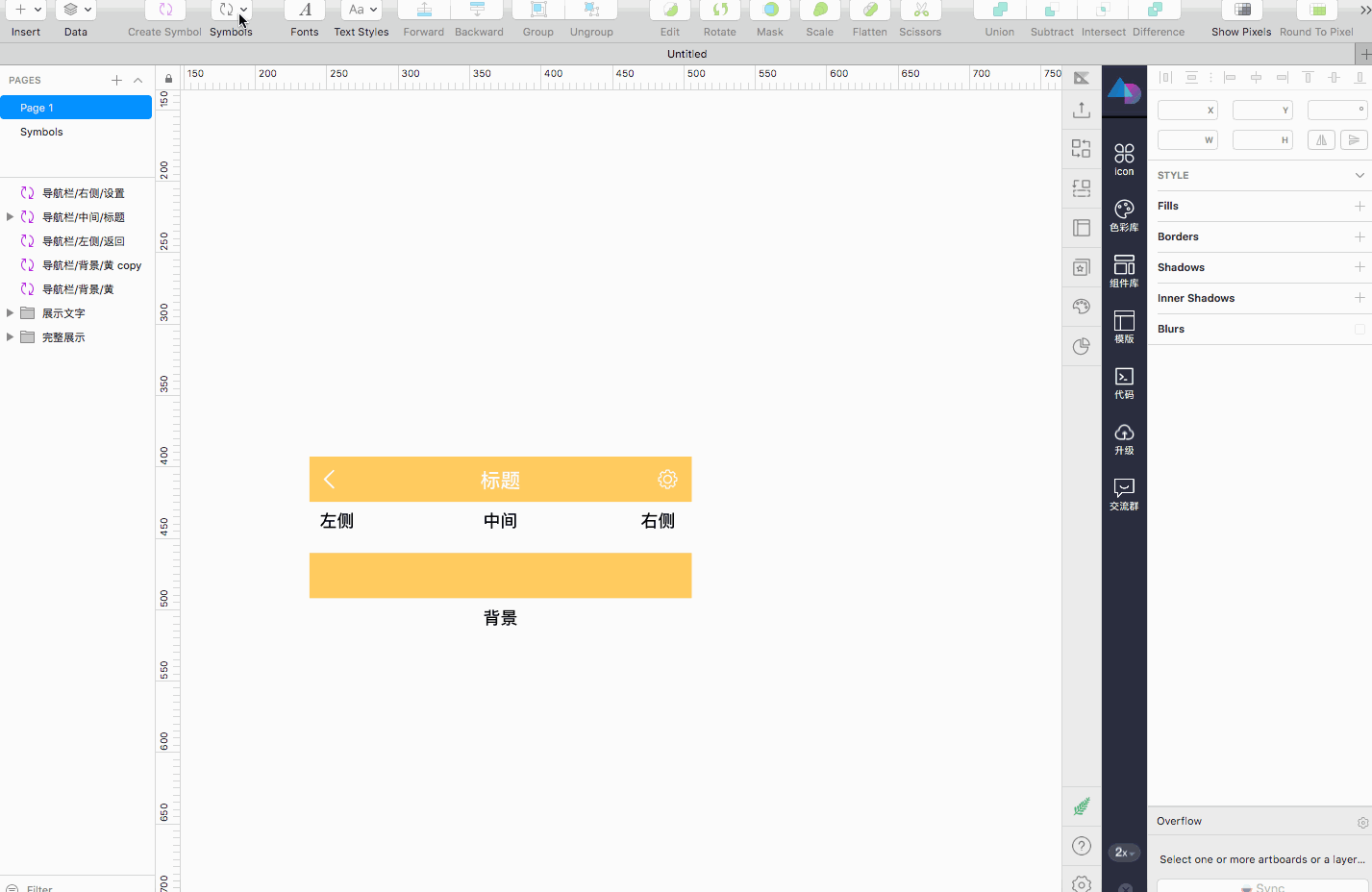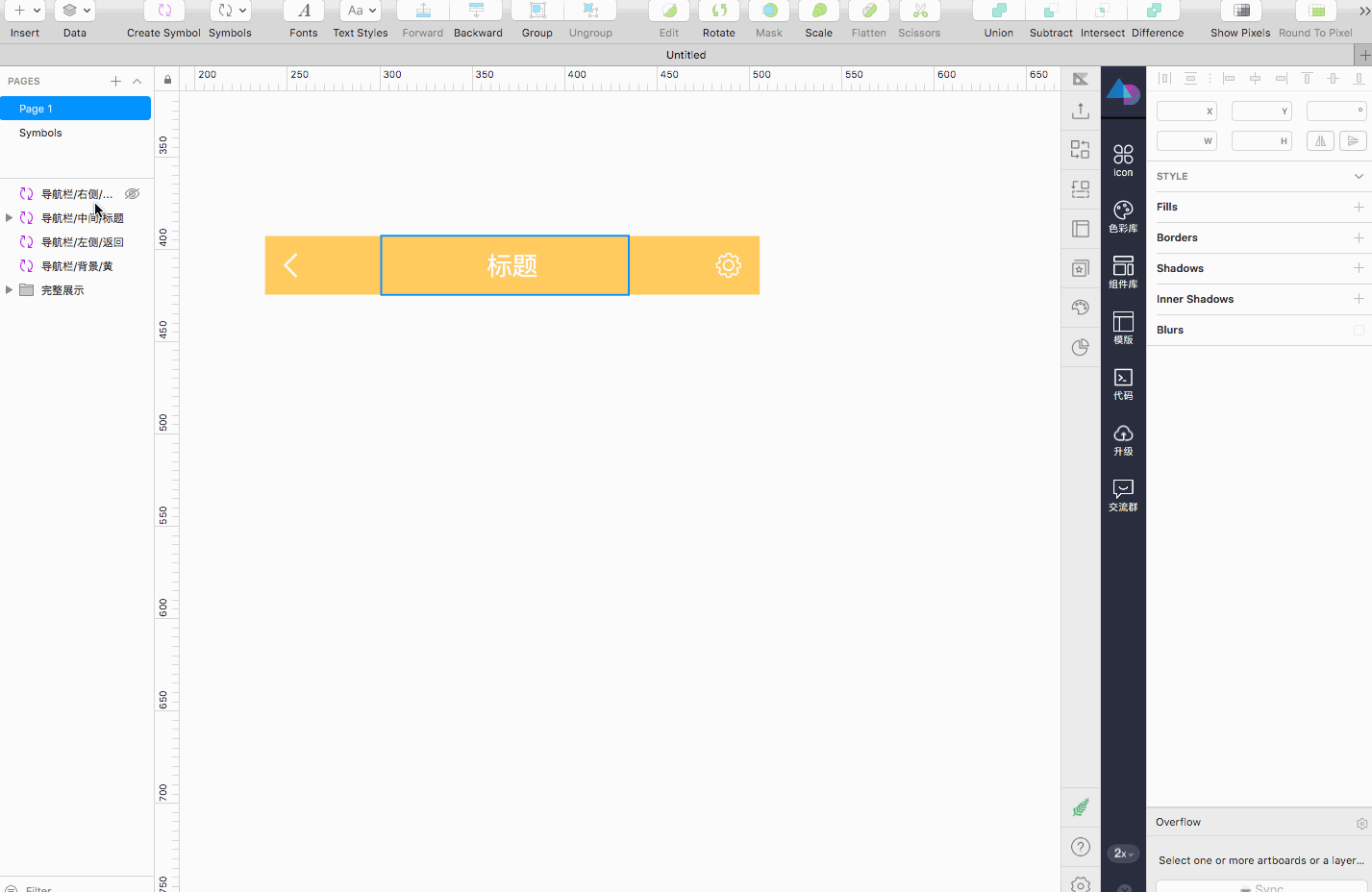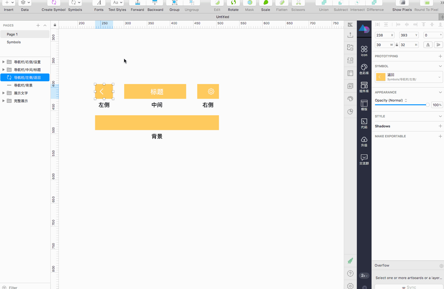 01.我先以最底层开始建起,以左侧为例,直接选中然后点击Create Symbol,在弹出的框中输入Symbol的名称即可。为了方便理解,我就直接命名“导航栏/左侧/返回”。