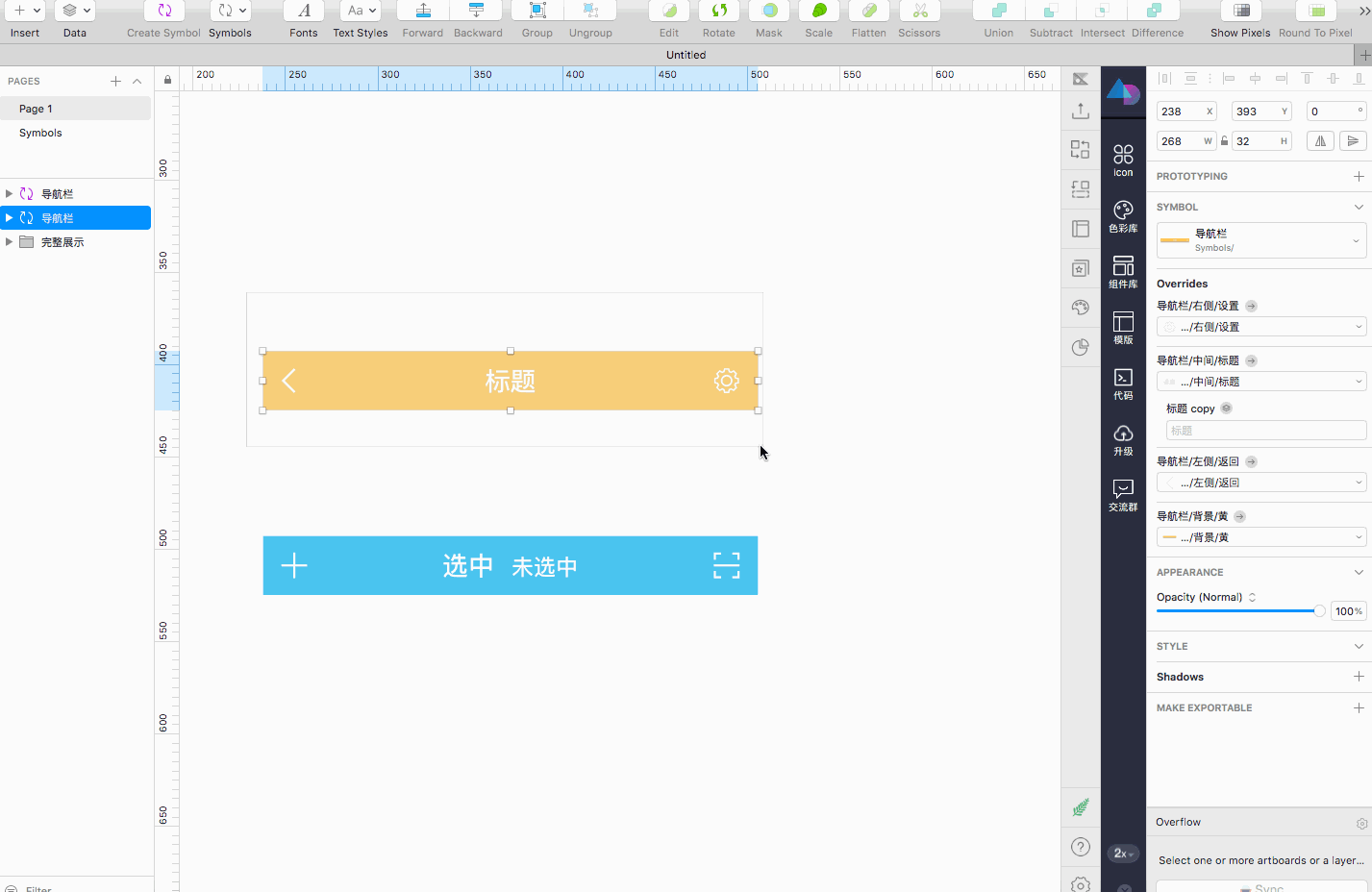 4.此刻在Page页面中把所有转换成Symbol的图层选中,然后再建立一个Symbol,命名为“导航栏”。这样,简单的一套组件就已经完成了。