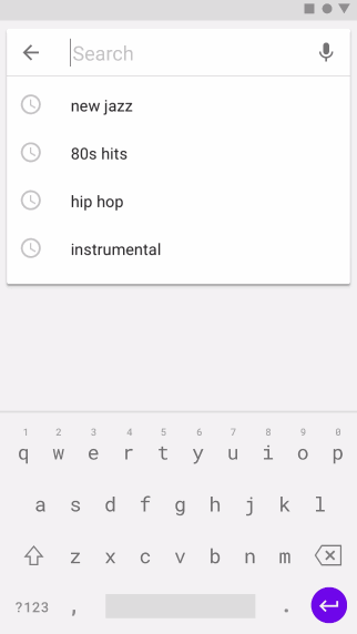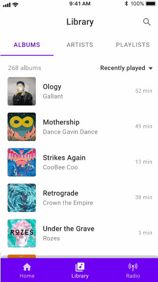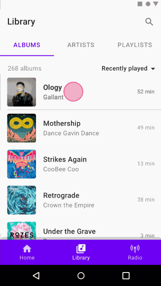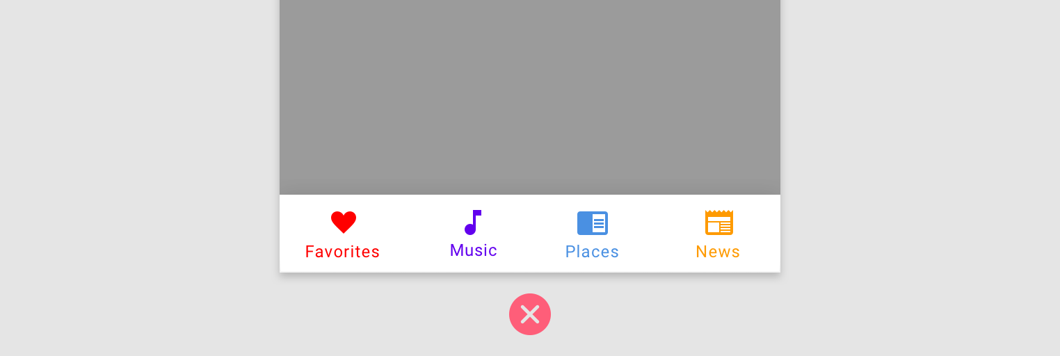 建议使用淡入淡出的动画在底部导航目标之间进行过渡。横向运动(一侧到另侧)过渡可能意味着不存在的项目之间的对等关系,或误导用户认为他们可以使用手势在各部分之间导航
