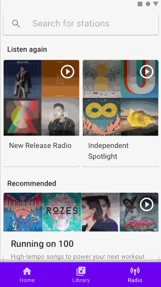 “Radio”屏幕的搜索功能触发屏幕键盘,暂时覆盖底部导航栏,直到搜索流程完成。