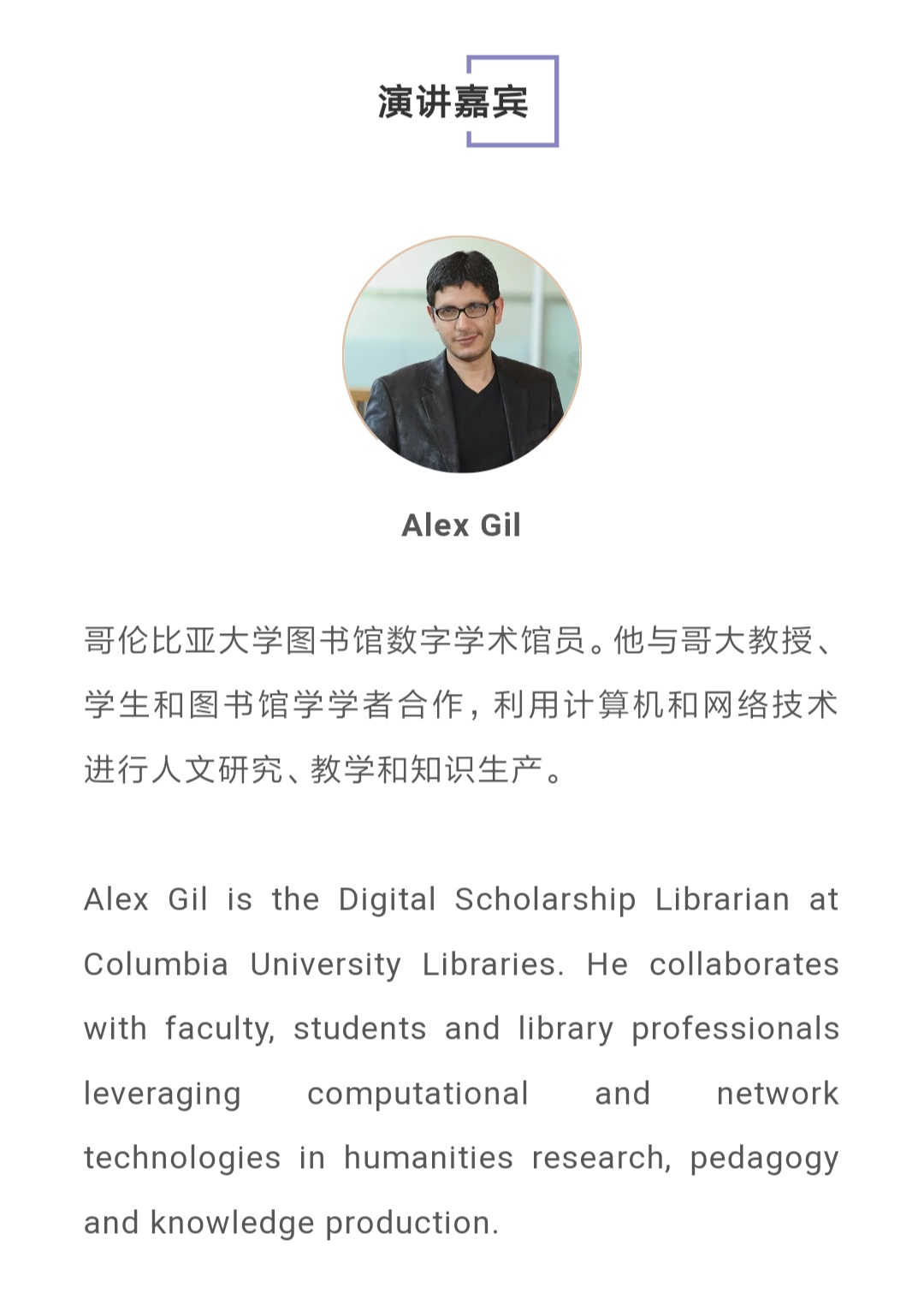在本次讲座中,Alex Gil博士将介绍来自团队在该领域的一些重要概念和实践,其中包括认知设计的方式、什么是最小计算、“灵活帐篷”等。他将和参与者一起讨论这些研究活动如何应用于课堂实践,以及如何和课堂教学相互交融。
