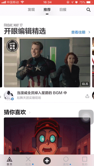 开眼这里跟上面Unsplash有点类似。在开眼编辑精选位置,但你进入视频观看,在观看完毕后返回首页,首页会轮播到下一个精选推荐,而不是你已经看过的内容。还有一个贴心的小细节是,开眼视频播放界面关闭是向下滑动的手势,这是有一定学习成本的,但开眼贴心的把左上角返回首页按钮也设计成向下的箭头,与手势呼应,起到提示作用。