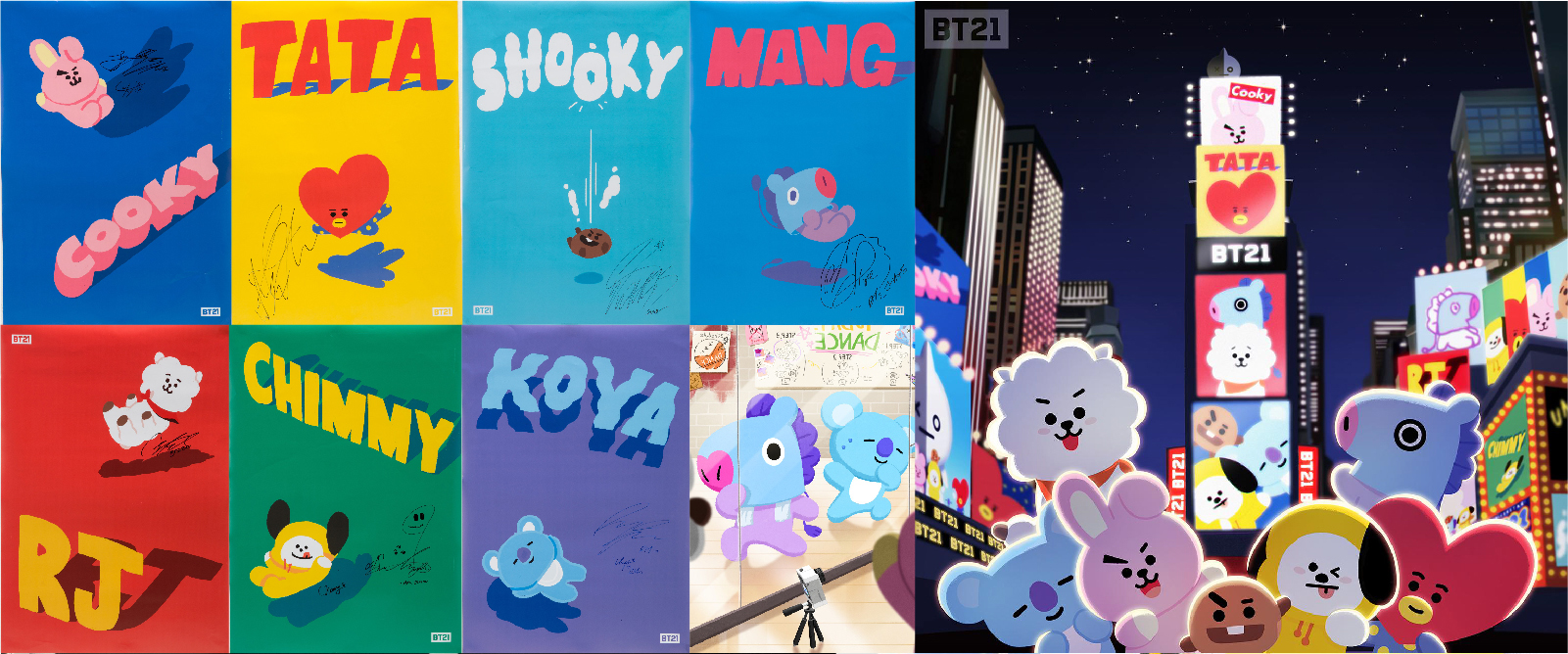 LINE Friends created a character brand based on the sketches of BTS members, and this BT21 characters were able to use the worldwide fandom of BTS to enhance the popularity. Over a year, BTS members participated in all the processes from initial sketch of the character to the overall design, character personality and the background story. As the process was revealed in a making film, BT21 received explosive responses from domestic and foreign fans even before its launch. The number of SNS followers for BT21 already reached 16 million on January of 2019. The fashion brands such as Converse and Antisocial Social Clubs collaborated with BT21 characters and those products were sold-out 1-2 hours after their release.