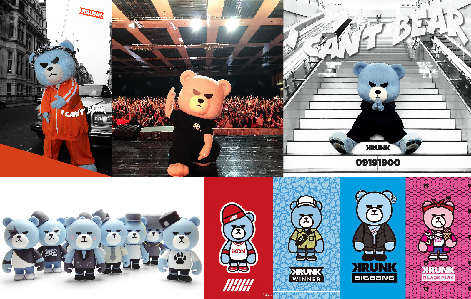 Krunk是由韩国著名造星公司YG娱乐创造的角色。以明星歌手为概念,你可以很轻易地在与YG相关的音乐视频、活动或广告中看到它。用于推广YG明星的各种Krunk商品和人物也很受欢迎。
