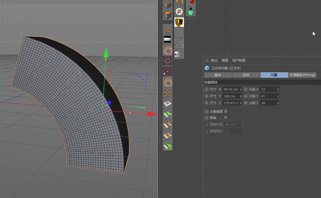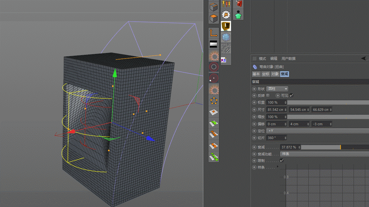 以其中“圆柱”为例,已知,已经给立方体的弯曲形变,但是只有在圆柱的范围之内的物体产生弯曲,衰减“圆柱”的参数可以在右侧的面板中调节。