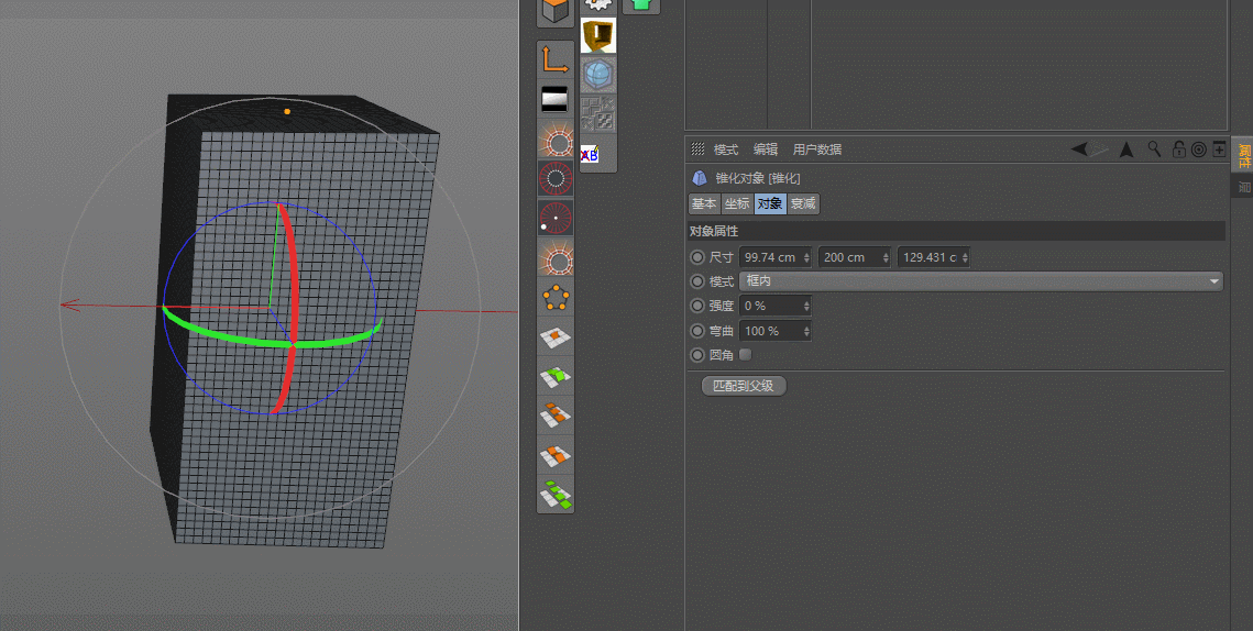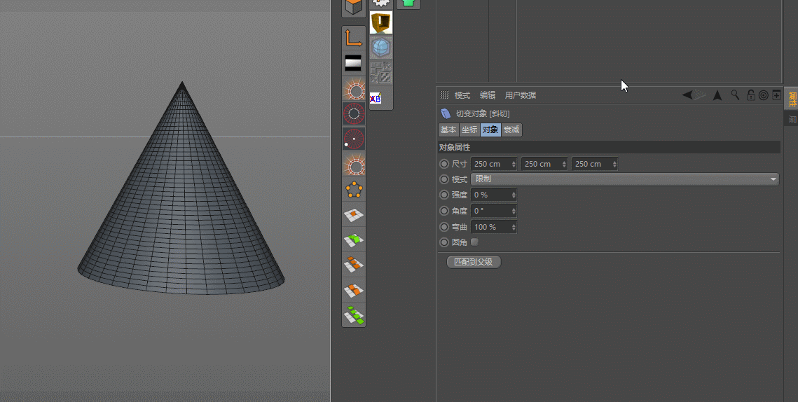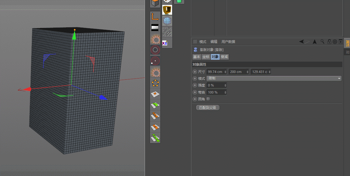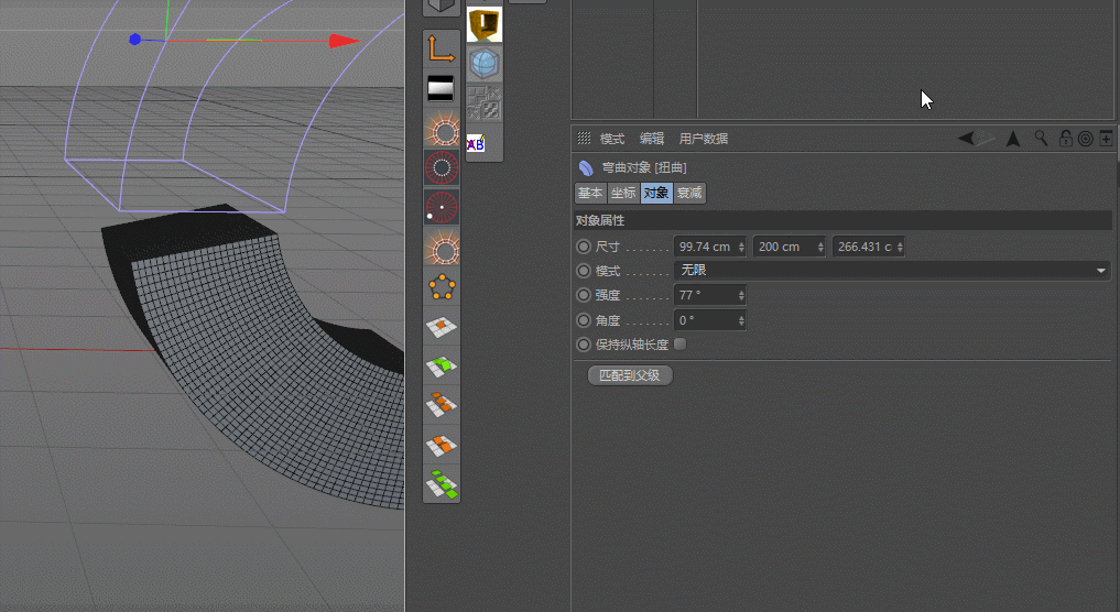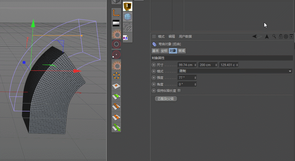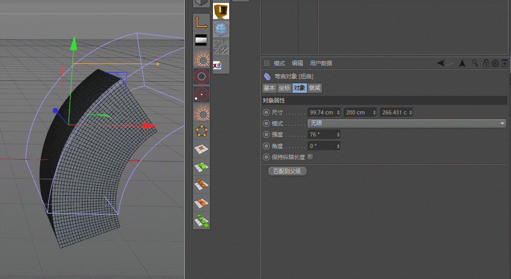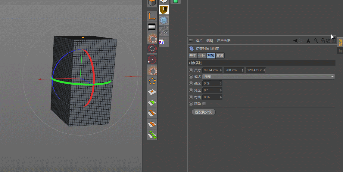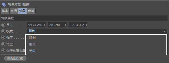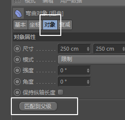 变形器:扭曲(弯曲)、膨胀、斜切、锥化、螺旋、FFD、挤压&伸展,这些变形器的“对象”选项中都有“匹配到父级”这个按钮