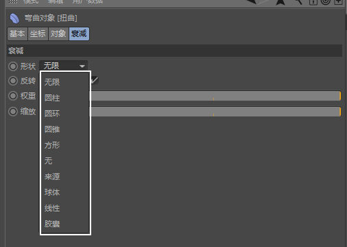 在这些变形器中都会有一个选项:“衰减”,以“扭曲(弯曲)”中的衰减为例。