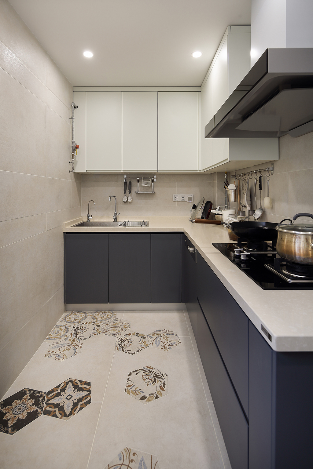 厨房是家庭生活不可缺少的空间,在颜色选择时应挑选灰度较小,明度较高的颜色,这样的颜色在视觉上会营造一种舒适轻松的氛围。而白色的厨房则会给人整洁、干净的感觉,适当点缀一些浅黄、淡蓝等色彩,让厨房充满活力与生机。
