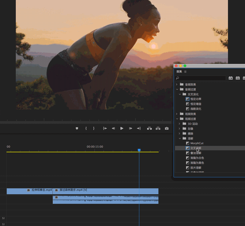 如果想让过渡效果更平缓稳重一些,鼠标选中过渡条可以左右拖动改变时长,过渡效果有很多,大家可以根据自己所剪辑片子的类型去尝试(ps:效果属性不仅可以拖动到视频的尾部,两个视频的中间、开始的地方都可以放置,在效果控件面板中也可以更改过渡条的大小)