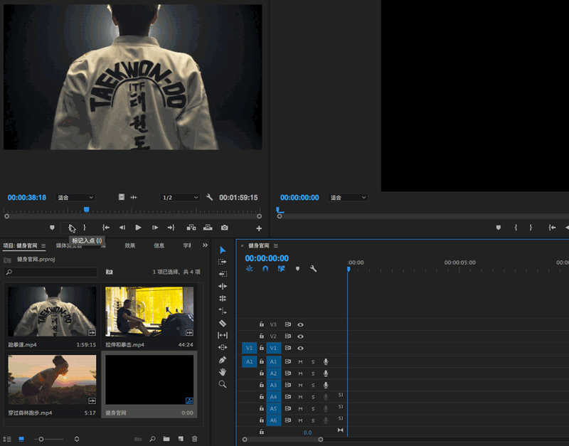 (ps: 键盘上的左键按一下是向前一帧,shift+左是向前移动5帧,右键相反,按一下空格是暂停/播放视频,时间轴视频剪辑区的v是视频video的简写,a是音频audio的简写,素材预览区的时间标尺右单机可以选择清除入点和出点以方便标记其它时间段视频的出点和入点)