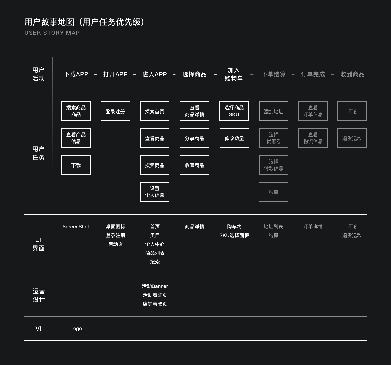 当产品功能和交互流程确定的情况,如何确定哪些内容/界面是优先级高需要进行风格化处理的呢?这里可以结合「核心任务」和「用户故事地图」筛选核心设计内容/界面。