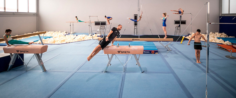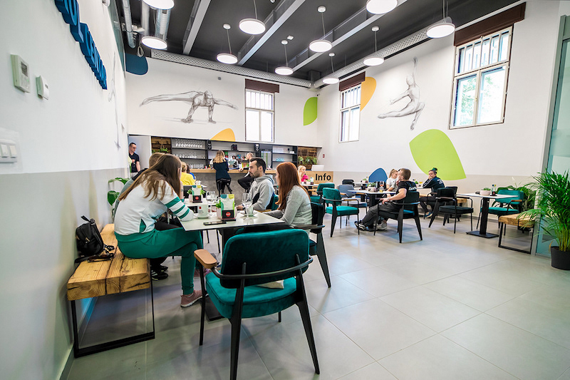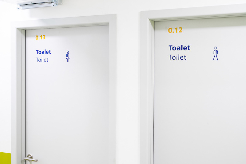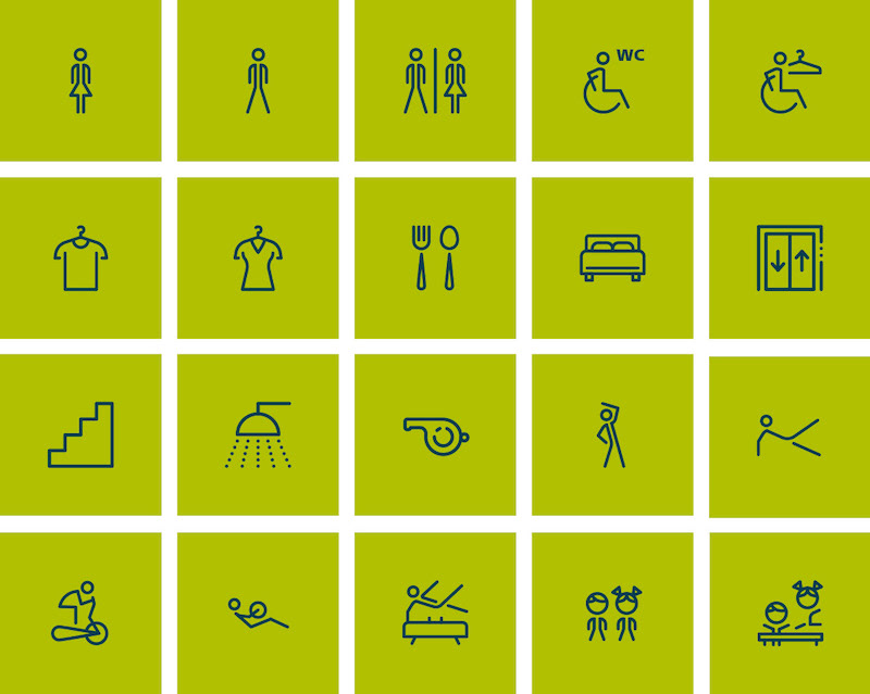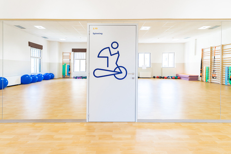 针对索科尔中心体操馆的特质,Studio 33设计了有趣独特的icon,具有较强的功能性,使设施更加清晰。根据设施房间的布局,用蓝色和灰色定义了两种类型的房间。蓝色房间提供给临时访客和运动员,灰色房间用于负责维护设施的员工辅助和技术用途。此外设计了一套体操运动员的插画,这些插图放置在大厅处作为装饰元素,展示了体操的动作和动态的复杂,营造了运动氛围。