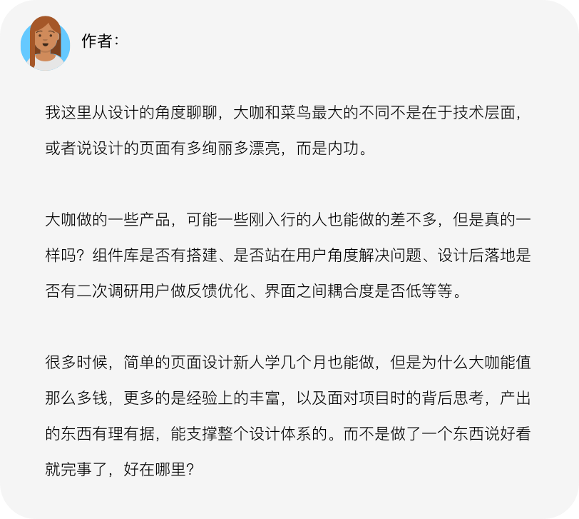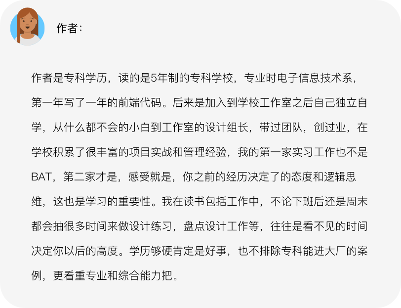 举个例子,设计师A和设计师B都在大公司担任UI设计师。他们都具备了优秀UI设计师需要具备的技能。设计师A是个非科班设计师,设计师B则是一名985美院毕业的设计师。