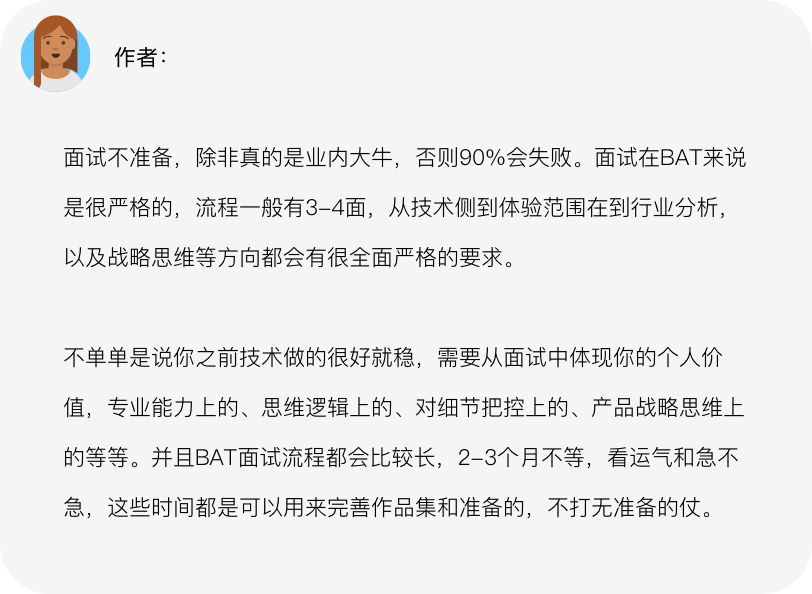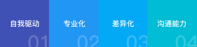 这里通过了四个特征方向来讲解,让大家了解除了技能本身以外还需要什么能力更容易进入大公司,分别是自我驱动、专业化、差异化以及沟通能力。最简单来说就是,我希望大家都能沉淀好体验设计师能力的同时,能专精其中某一模块,比如界面或者原型。在这基础之上能有些差异化的成长,比如喜欢写作的可以多体验产品写写体验报告,喜欢创作的多学习下动效的知识,这会让你比别人更具备优势。