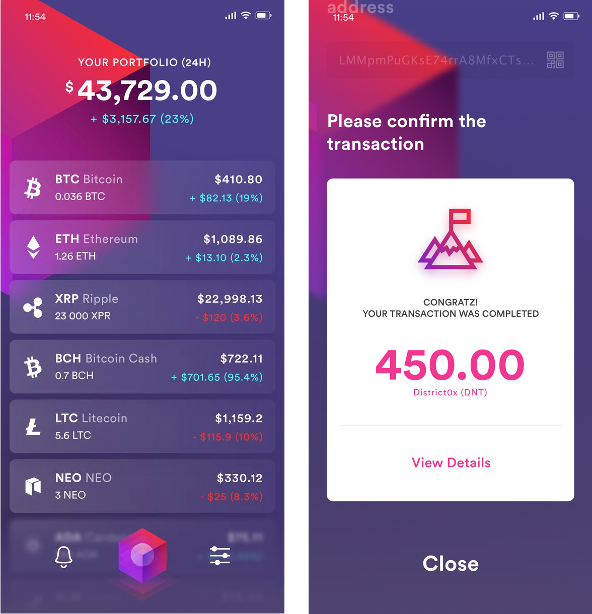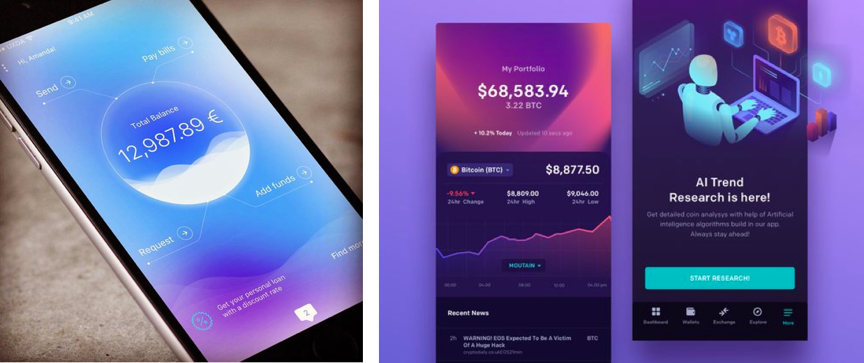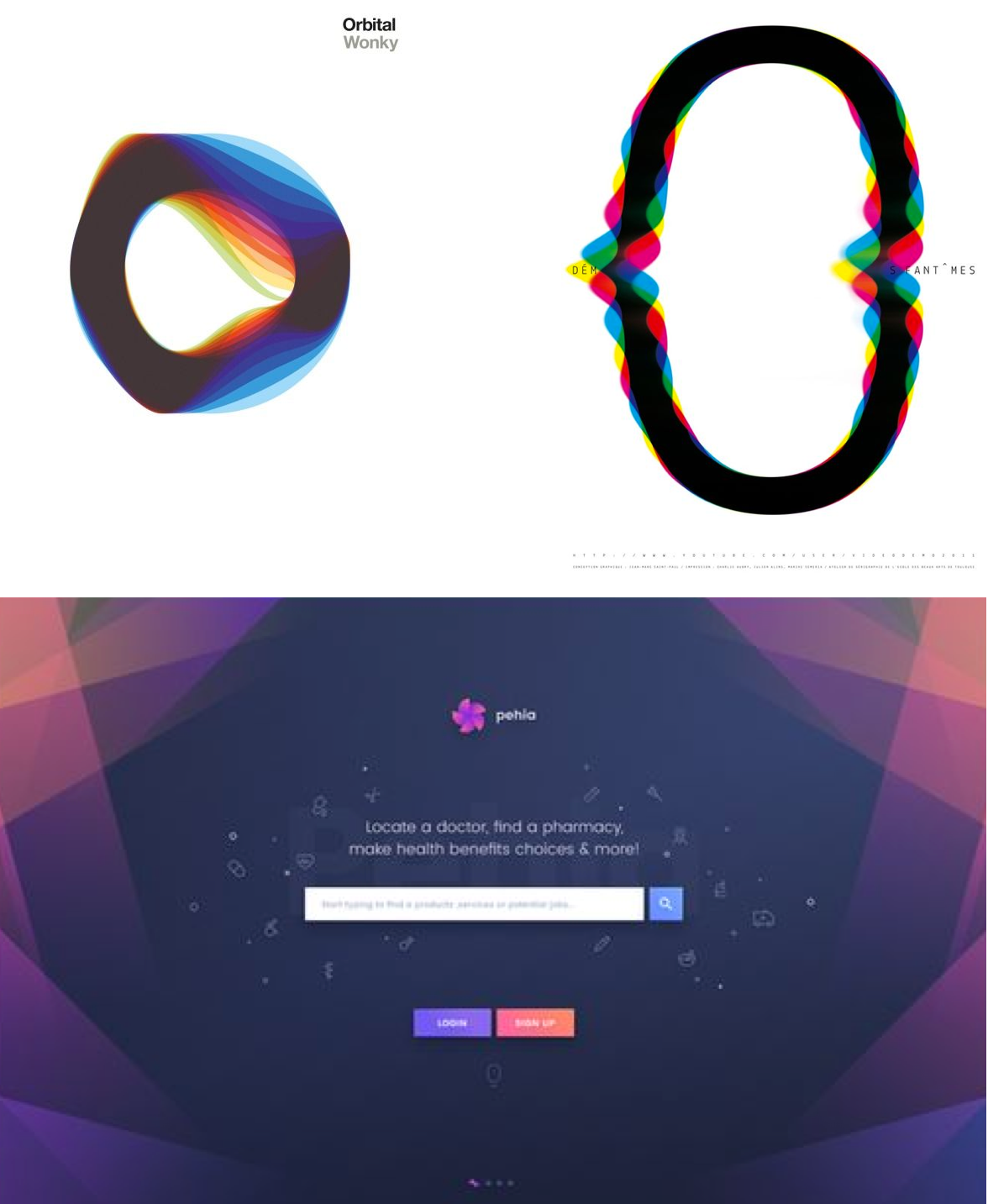 ▲ 这个设计在主图形上运用这种渐变叠加,通过透明度,角度变化叠加在一起,像一只绽放的花一样呈现多样的层次,按钮上也是比较明亮骚气的渐变,同时在底部的曲线上也运用大光斑作为光的点缀,是一个典型柔光的设计案例。
