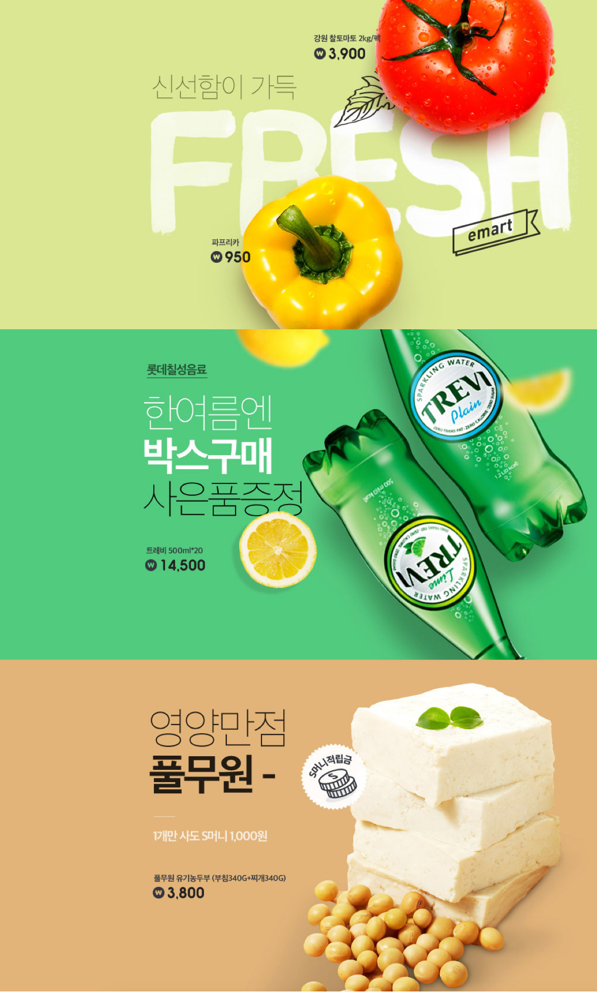 ▲emart官网的banner,有一段时间,他们的文件夹里面出现了大量水果或食品局部特写,结合文字排版的图片,不久在他们的电商页面就出现了,类似这样风格的设计。