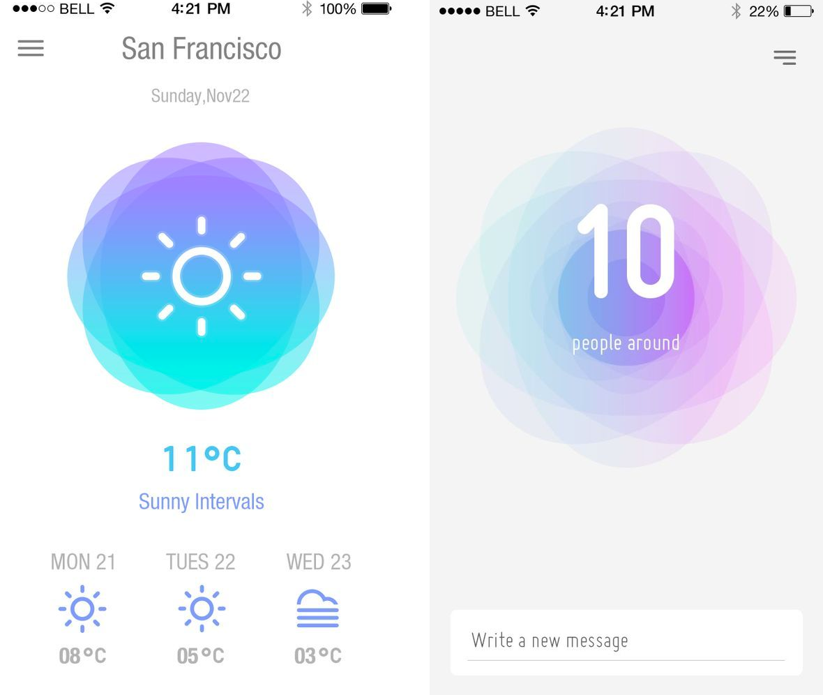 ▲ 一组天气的设计,同样运用重叠,颜色叠加的手法配合动效的运用,让天气像花一样绽放