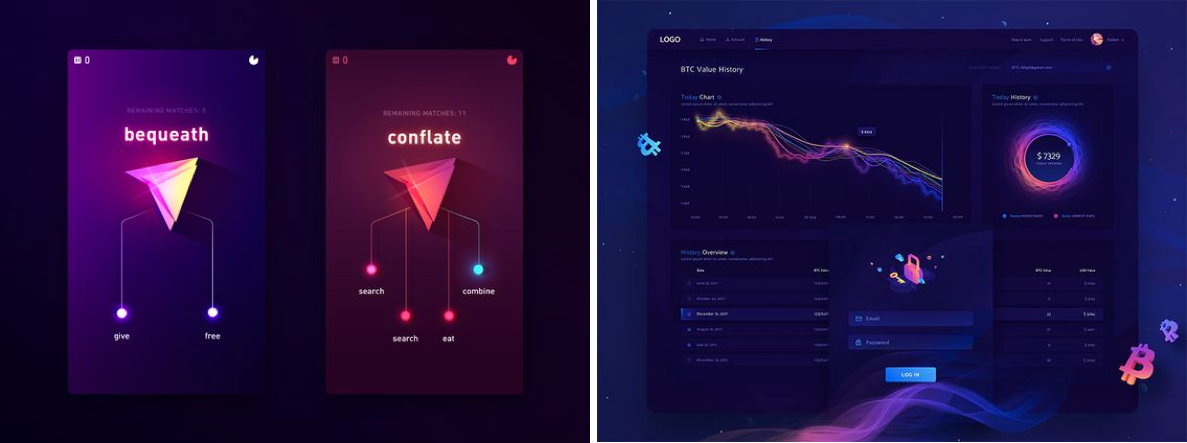 ▲ 在(左图)扫描页面中,核心图形运用波浪透明叠加线条作为页面核心焦点,背景底部运用骚气渐变和光晕,形成丰富层次,(右图)的背景和插画部分也是大量运用这种手法。