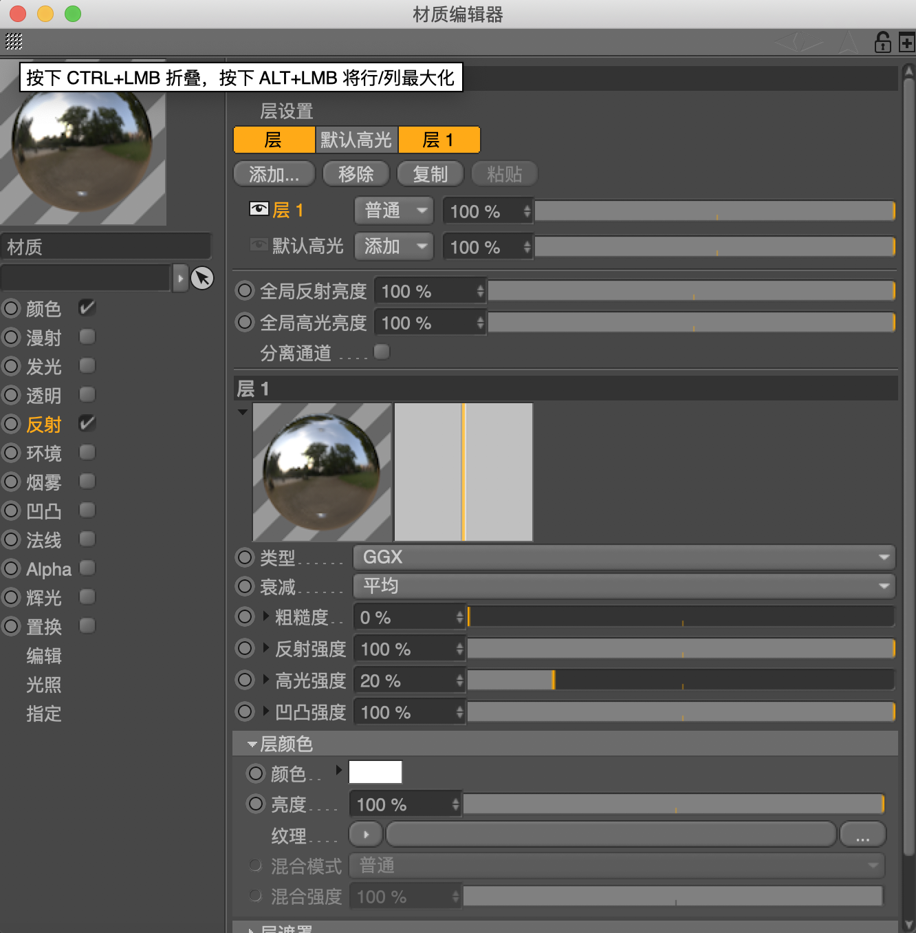 (1)类型:决定物体对光的反射状态(倒影的清晰程度)(强反射GGX/中反射Phong/弱反射Blinn、Irawan织物)