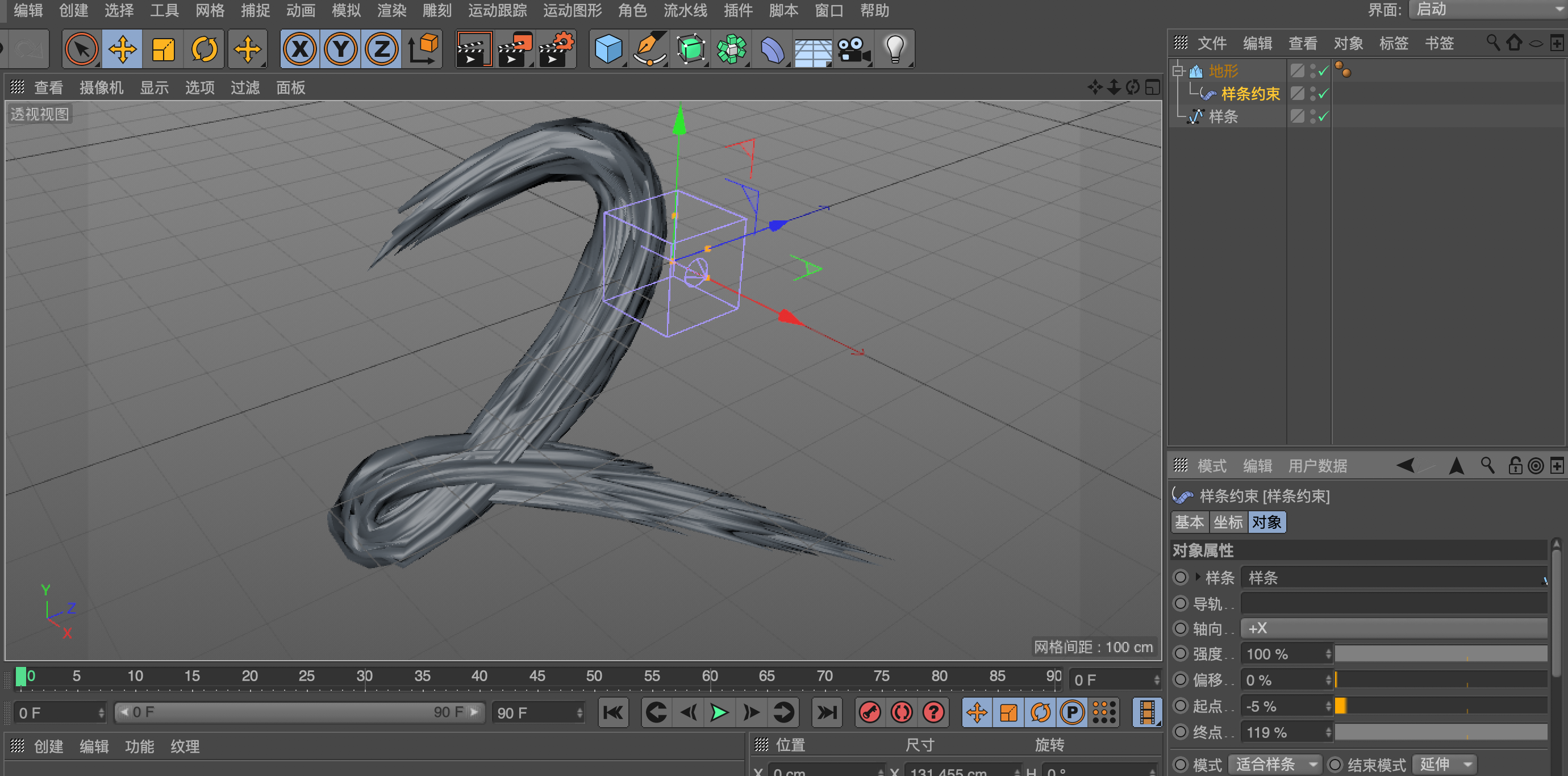 (2)给物体添加“样条约束”(作为子级),选中样条约束,将样条路径线拖拽到对象属性里的“样条”栏内,调整轴向