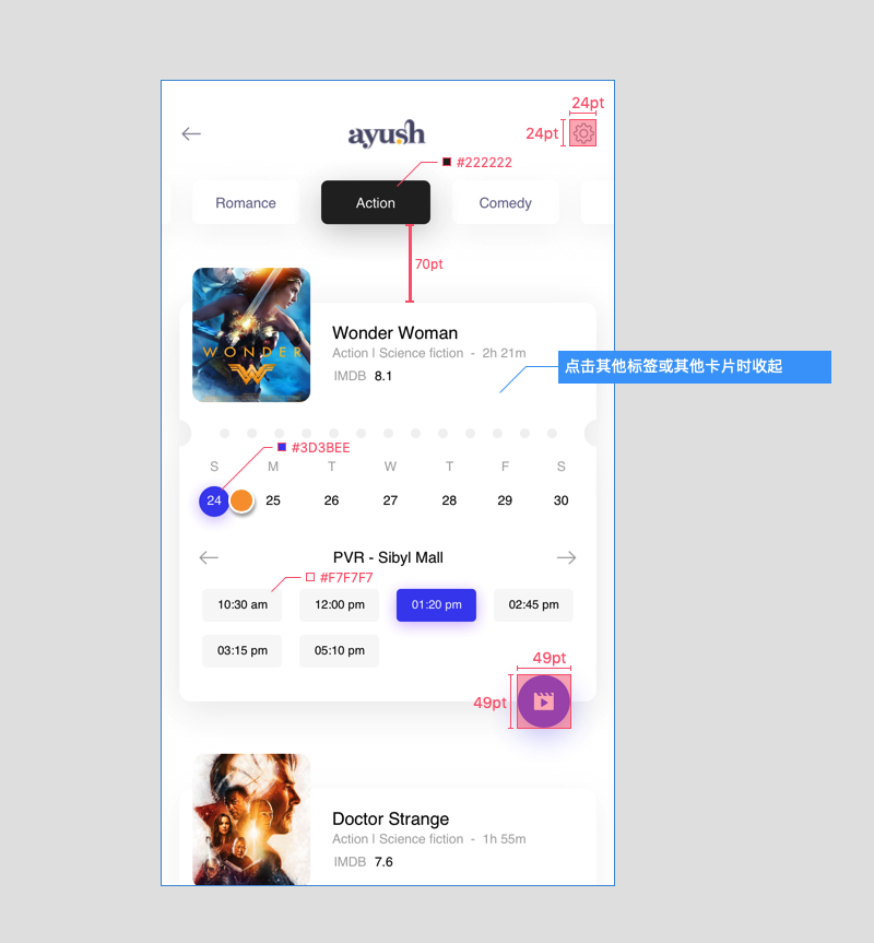 Movie Booking是一款简单好用的在线购电影票APP,提供最新最快的购票资讯,简洁的层级和简单的逻辑,帮助用户快速完成购票操作。例子中将展示使用Movie Booking的购票操作流程。我们可以使用iDoc中最常用的8种交互方式以及15种交互动画,展示基本的页面跳转,以及滑动确认的效果。