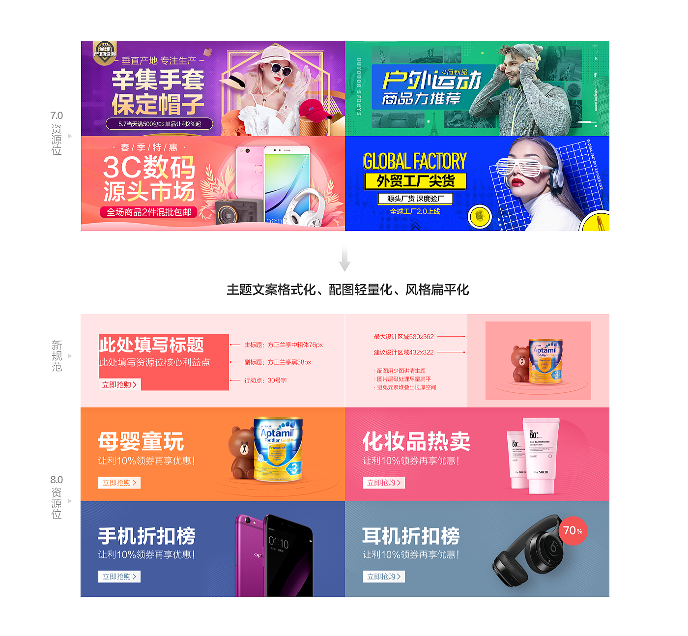 Banner升级:7.0的Banner画面丰富度高,加之描述字段多,用户阅读有一定成本,较难在3秒内掌握全 Banner的信息。此外,相比于C类用户,B类用户会更偏理性,我们选择以更冷静、克制的“视觉语气”与B类商人对话,而非渲染氛围引导点击。(上线后,同样的活动内容,按新、老两版规范设计投放两套Banner,新版较老版UV CTR约高出48%)