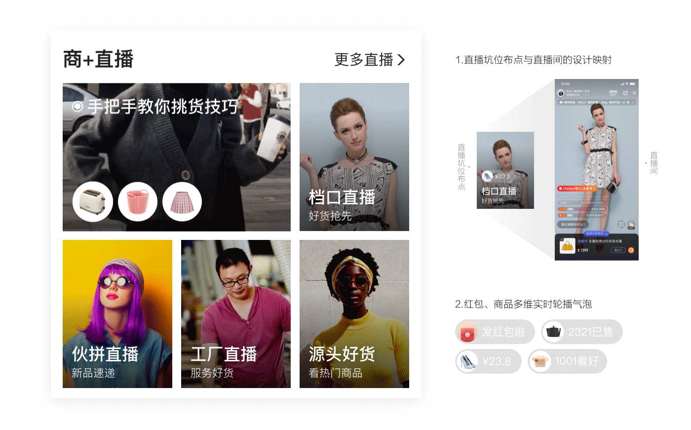 内容场景(直播)动态化、互动感、实时性传递:抽象出直播间的方形版面+内容叠加形式来设计,大坑位以动图传递给用户直播的动态感,以红包、个性化商品的多维实时轮播气泡传达直播的互动感、实时性。