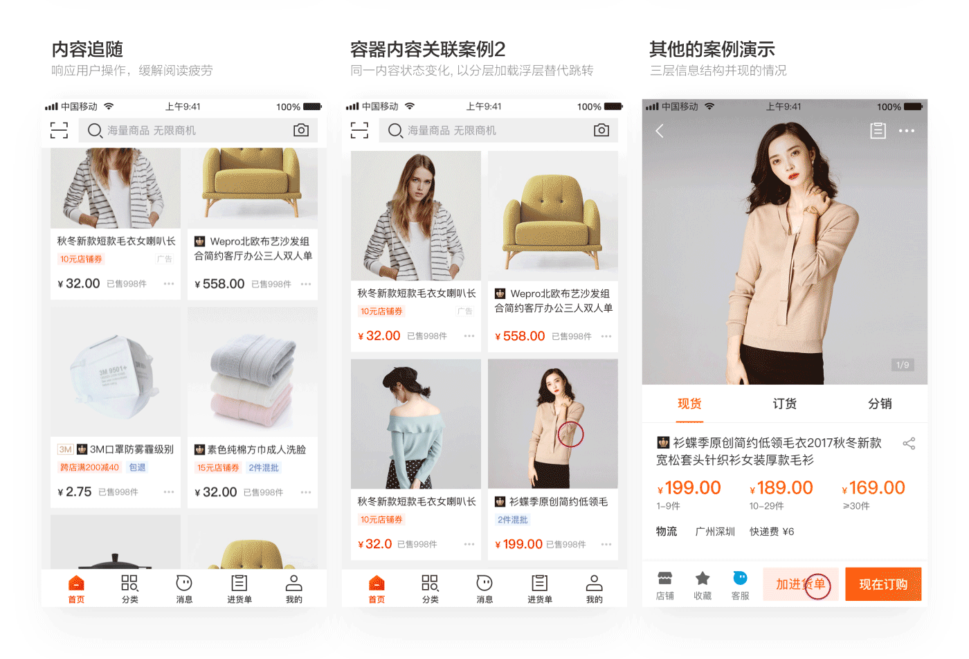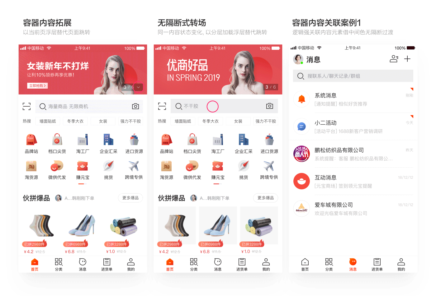 3、体验升级:移动端APP天然生长在手机系统上,系统的风格更迭也牵动着APP的变化和升级。在8.0升级前,1688APP存在着5.0、6.0、7.0多个由不同设计师在不同时间点所设计的场景,到8.0,APP趋待从框架层、表现层以及品牌等方面进行统一及升级。