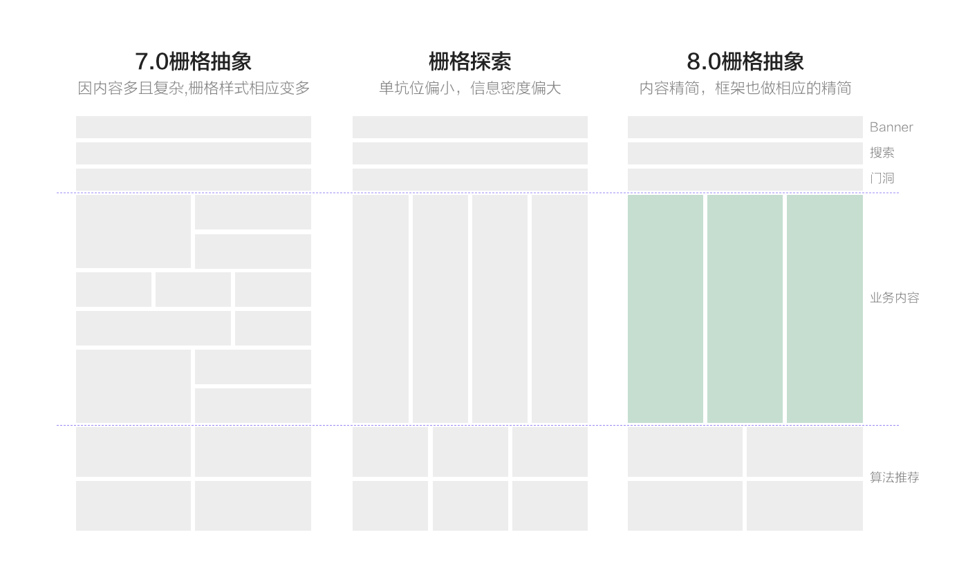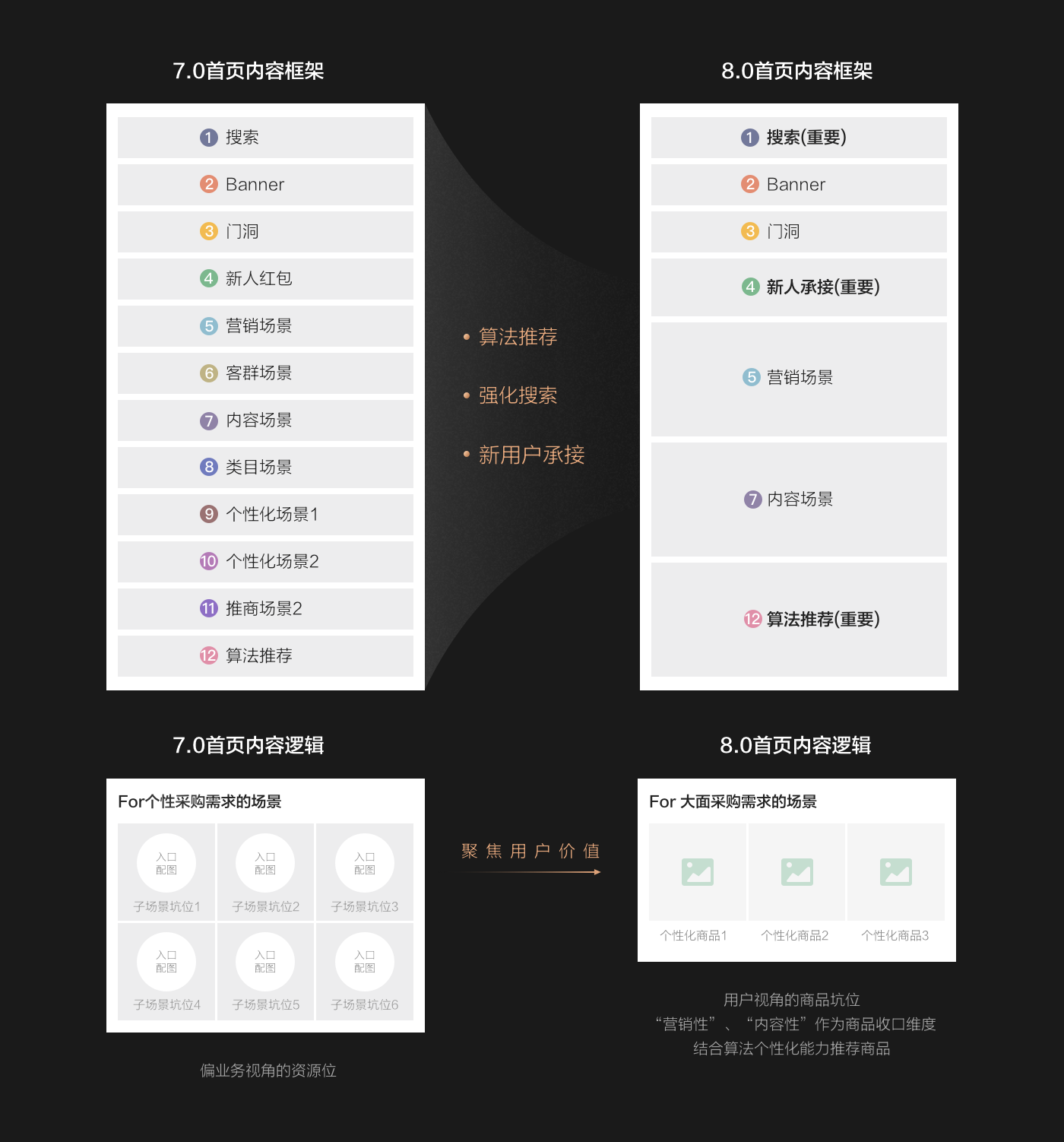 在内容框架制定上,我们聚焦用户价值,舍掉7.0时的内容版块个性化,聚焦做商品的个性化,仅保留For大面用户的营销、内容场景,提升算法推荐区的曝光率,以此区域的商品做首页的直接转化。