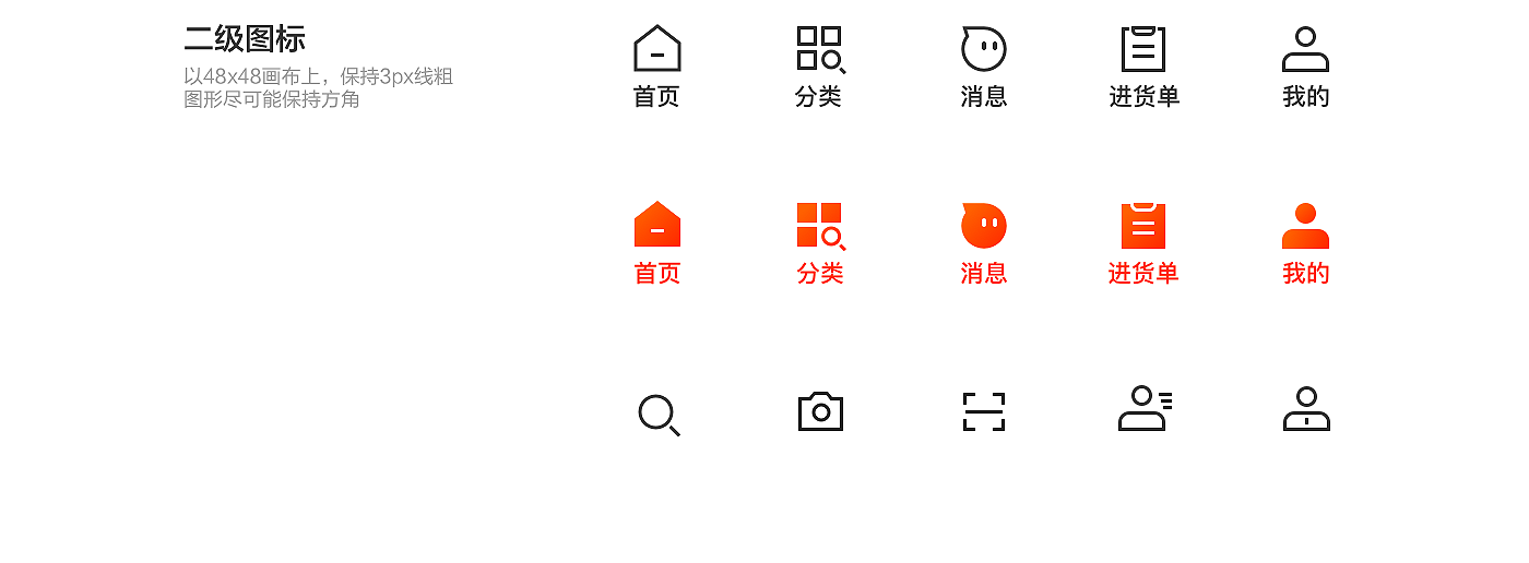 在阿里巴巴商业操作系统中,1688聚焦做B类业务,直接服务对象是B类买卖家,业务细分出档口尖货、淘工厂、企业采购、淘货源、微商代发、工业品超级店、跨境专供等,这些都是具有一定B类特质及体量感的场景,故在APP业务门洞及常规图标的表达上,基于扁平vs写实、轻盈vs厚重、活泼vs稳重的维度,图形选定轻拟物、弱对比的设计范式,塑造B类场景For买家的沉稳、份量感。