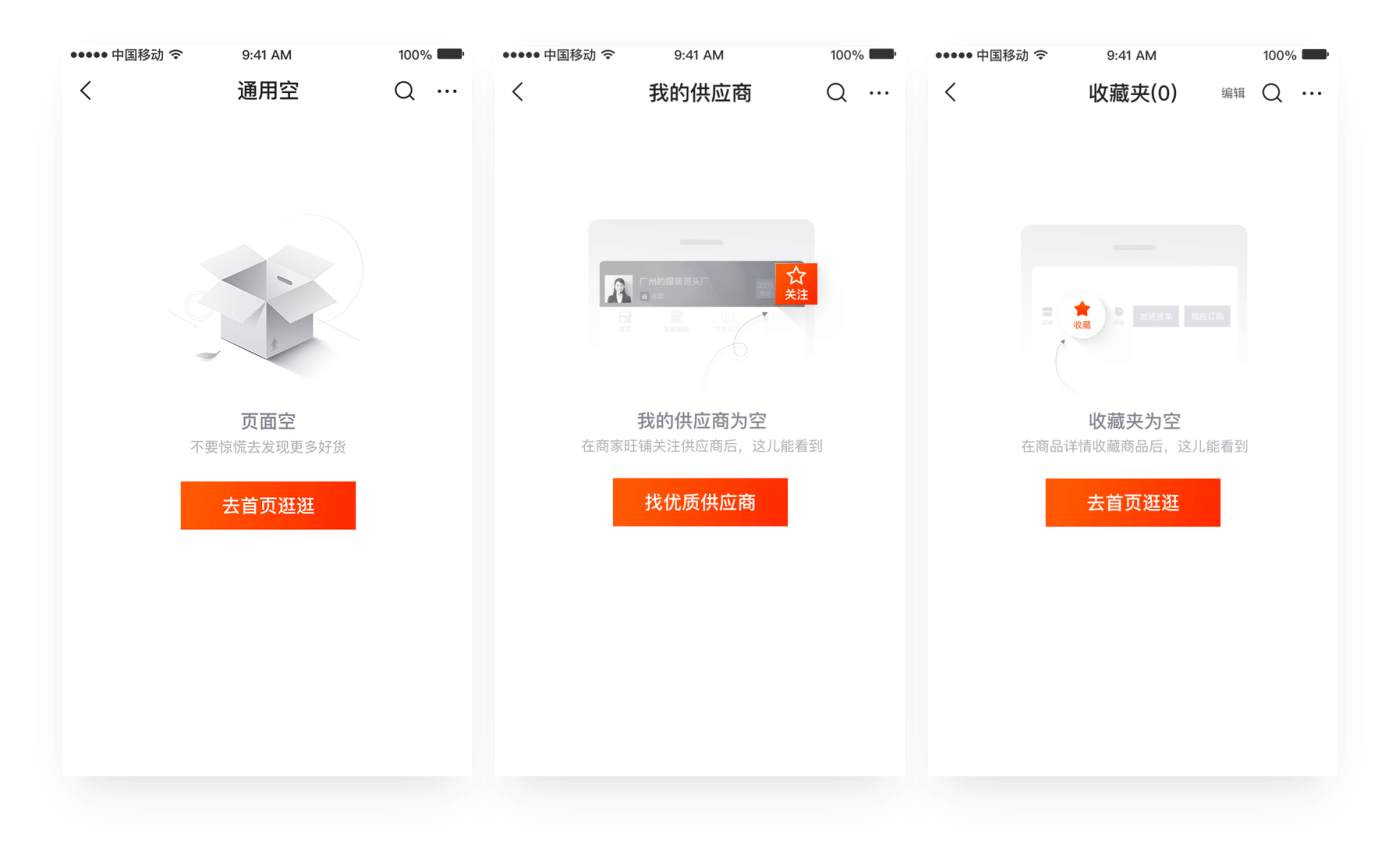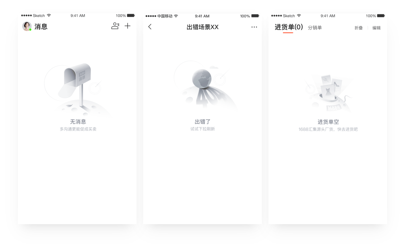 此外,异常/空白场景也是平台与用户互动,塑造用户感知品牌的机会。在空态情感化插图部分的绘制上,力求塑形出有份量、易读、有意味的场景以示对应空态,并佐以轻微动效,增强空态的互动感。(在收藏夹、我的供应商等工具型场景,基于空态信息的价值考虑,将空态与工具新手引导相结合,并未做常规的插图)。