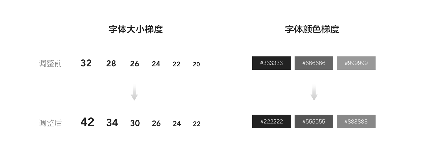 拉大字体大小的梯度,加重字体颜色梯度,提升文字的清晰度和可读性。