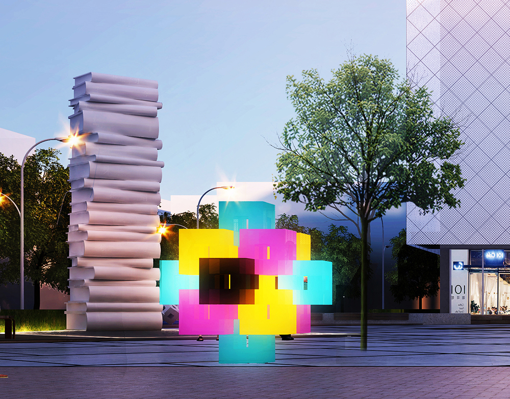入口处设置了项目LOGO造型和书塔造型的装置,简单明了地昭示着项目的属性。完全开放的入口、不刻意而为的景观氛围让人们自然走进这方天地。
