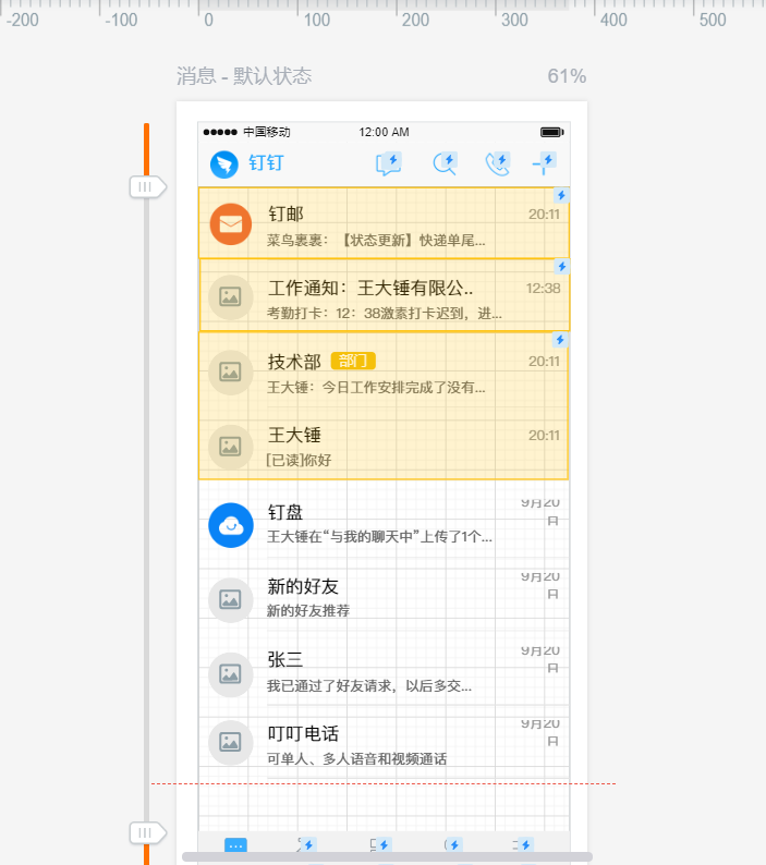 “钉钉”原型里主要结构由“消息”、“DING”、“我的”三大板块组成,“工作”页面、“联系人”页面是钉钉的一大亮点。下文着重分享包含使用频率较高的“消息”页面、“工作”页面、“联系人”页面、“管理专区”页面,方便做企业服务产品的人借鉴和复用。